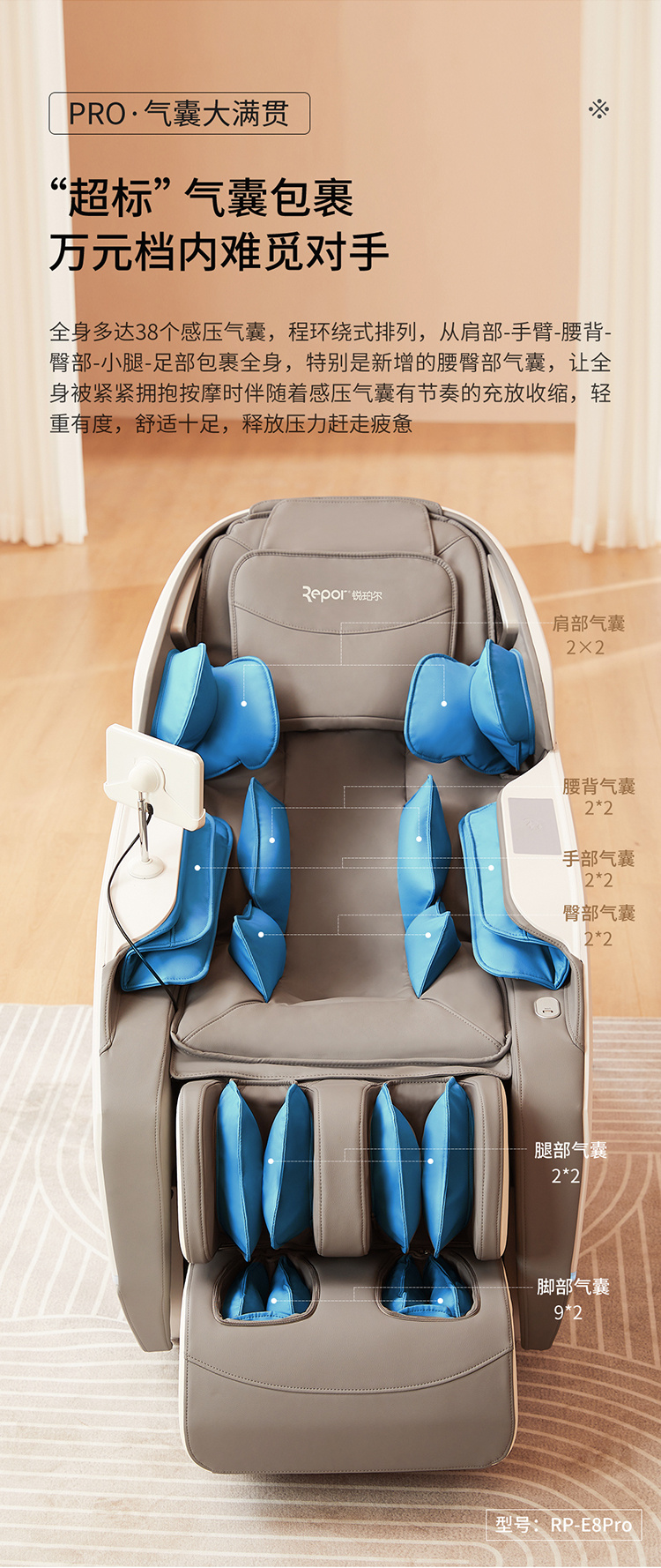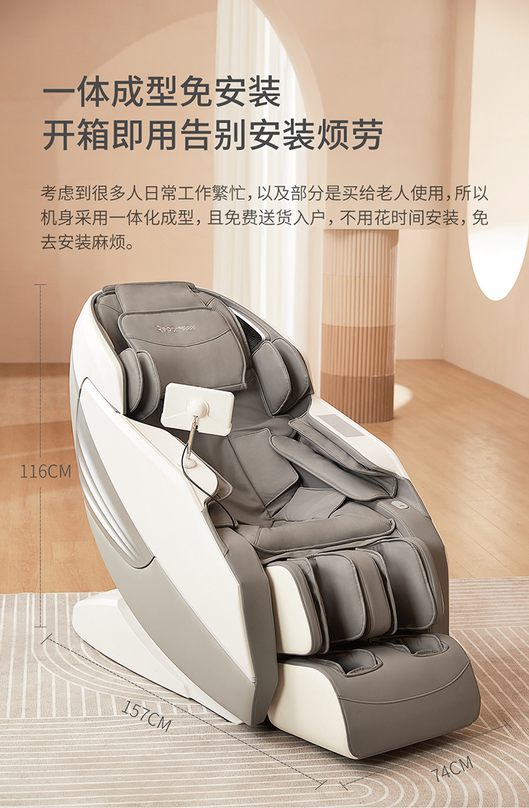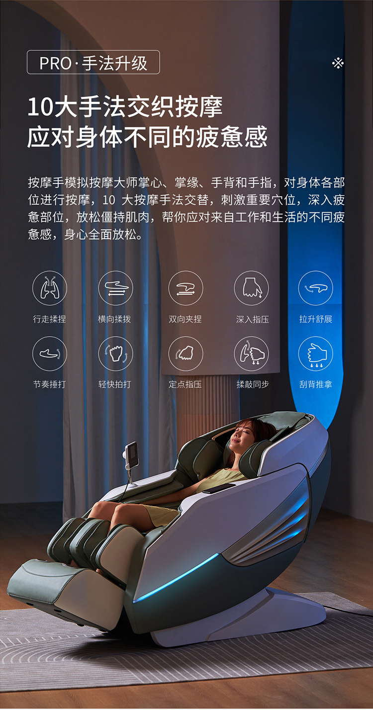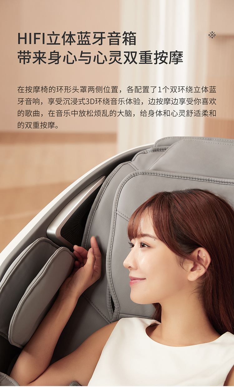 銳珀爾集十余年技術(shù)積累,傾力打造銳珀爾新款按摩椅4D穴感總裁椅,擁有全新的AI智能語音,小腿溫?zé)崛啻?、腳底震動、4D機械手等全新功能創(chuàng)新,智能健康體測,可以檢測血氧、心率、微循環(huán)等數(shù)值,通過大數(shù)據(jù)分析,給您提供合理的改善方法,時刻關(guān)注您的健康狀況;超大液晶智能觸控,專為總裁量身打造的特色按摩程序,20分鐘快速補充精力,多種按摩程序,滿足全家人的需求。