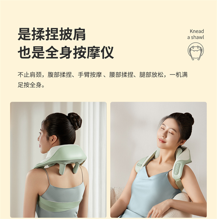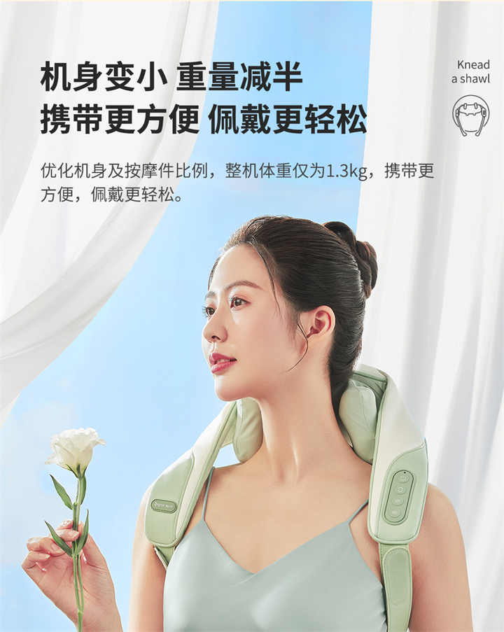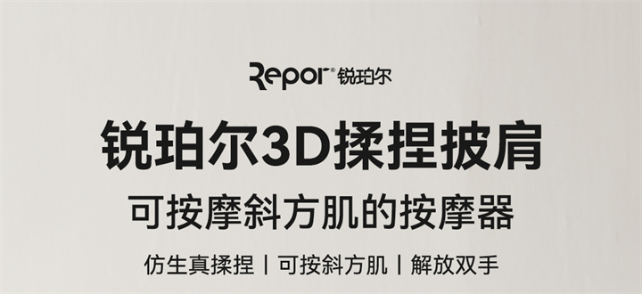 銳珀?duì)?/a>揉捏披肩RP-R7,全新感受,可按摩斜方肌的按摩器,覆蓋肩頸,將中醫(yī)揉捏技術(shù)與數(shù)字化融合,模擬中醫(yī)人手開合夾、捏、揉、推等按摩手法,盡情釋放身體疲憊,升級(jí)降噪直流純銅無刷電機(jī),重量更輕,無線,攜帶更方便,大面積熱敷,熱力柔和滲透舒緩。