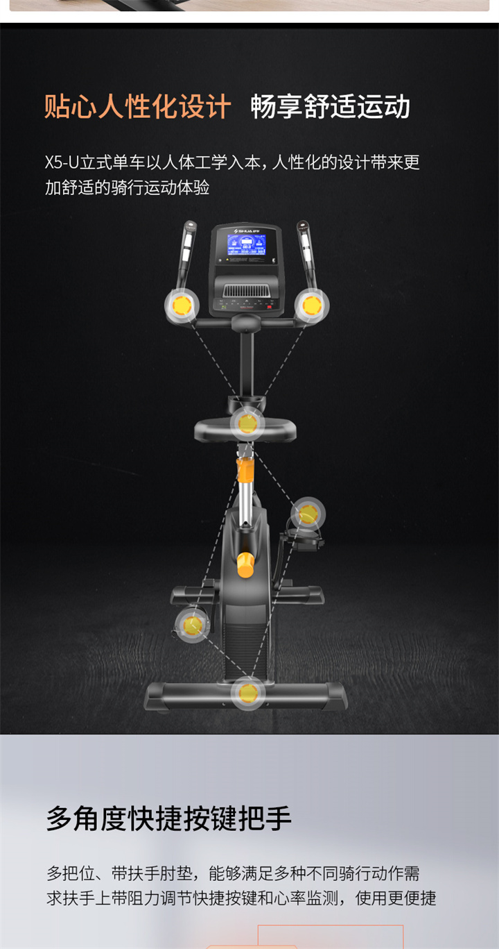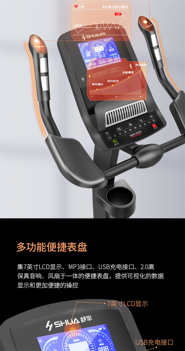 舒華立式商用健身車SH-B9100U(V10)觸屏版擁有超大顯示和操作屏幕, 可以任意設置阻力、時間和距離等參數,還可以即時顯示心跳和轉速等數據,同時,SH-B9100U提供多項科學運動處方,更輕松掌握運動節(jié)奏。