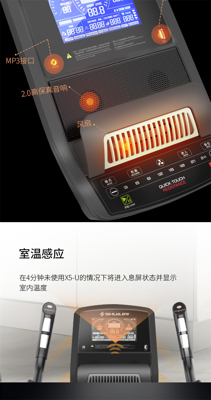 舒華商用跑步機SH-T8919采用t2.2mm黑鉆紋(可選配:t2.4免維護跑帶)的跑帶,,選用手握心率測試 自帶心率帶及增加心率控速(HRC)程序模塊、接觸式心率感應測量心跳等數據,跑步面積達580×1570mm,可承受180kg的使用者使用。